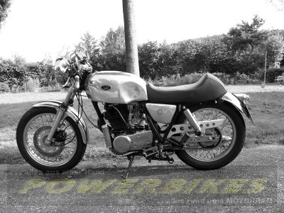 Powerbikes-Yamaha SR500: Umfangreiche Umbauten, darunter BSA-Alutank, Sitzbank und Heck, Instrumente, Mikuni-Flachschiebervergaser, Gabel,